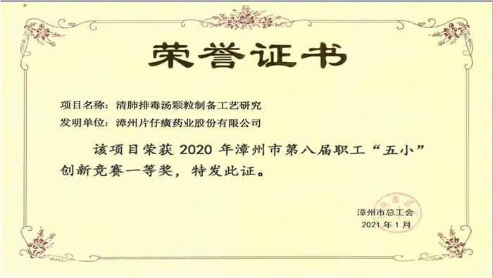 近日,漳州总工会下发文件,表彰一批在漳州市第八届职工“五小”创新竞赛中获奖项目和创新能手。漳州片仔癀药业股份有限公司“清肺排毒汤颗粒制备工艺研究”项目荣获一等奖,项目发明人曾金香同志喜获创新能手称号。