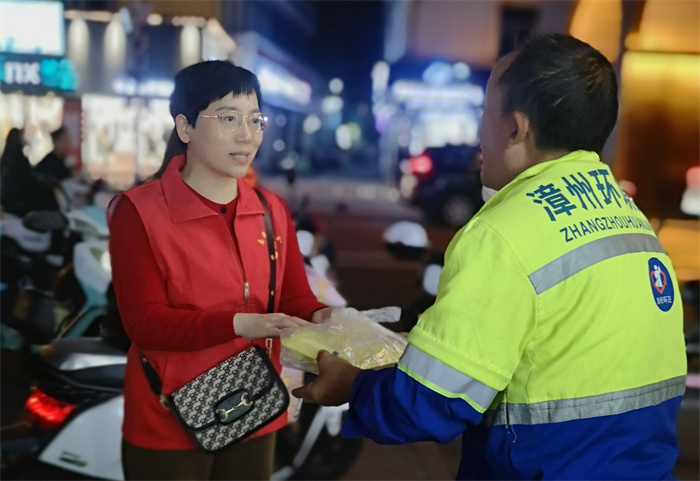 药业第一党支部组织开展为环卫工人送“爱心餐”志愿服务活动。支部书记张晓娟带领党员志愿服务者,走上漳州市区街头,为正在忙碌工作的环卫工人送上热气腾腾的爱心晚餐,让环卫工人体会到漳州这座文明城市的温暖。