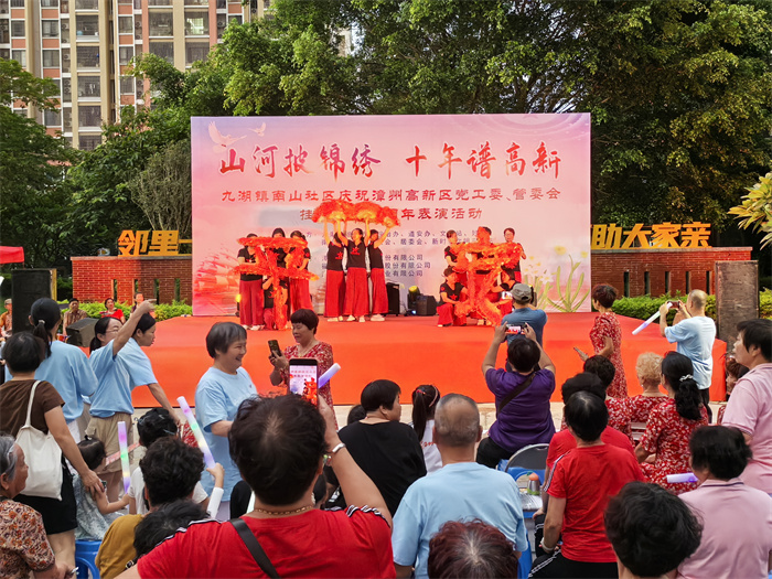 活动现场人头攒动、热闹非凡,片仔癀志愿者们在现场维护秩序,确保了表演活动顺利进行。居民自发组织的庆祝表演活动开演,吸引了广大群众到场前来观看。此次活动所有节目均是居民群众自编自导的。南山乡亲舞蹈队的《母亲是中华》、南山社区网格小组长带来的《三句半》防诈骗宣传、吉祥广场舞的《鼓动天地》等节目轮番上演。居民群众用歌声、舞蹈表达对党的祝福,对高新区美好生活的热爱,现场高潮不断,欢呼不停。
