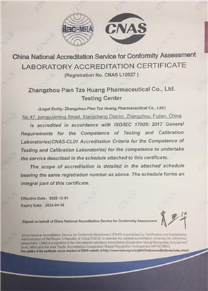 2020年12月1日,漳州片仔癀药业股份有限公司检测中心取得由中国合格评定国家认可委员会颁发的符合ISO/IEC17025:2017新版实验室认可证书,正式通过国家实验室认可复评审+变更评审,恢复我司检测中心搬迁后的国家实验室(CNAS)认可资格。是我司检测中心从2018年4月首次获得CNAS认可证书后再次取得具有里程碑意义的一次认可资格。