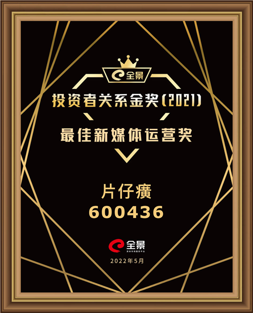 近日,由全景网主办、南开大学中国公司治理研究院参与推出的“全景投资者关系金奖”2021年度全国性评选,经过专家顾问组最后环节的评审,获奖榜单正式揭晓。漳州片仔癀药业股份有限公司荣获“投资者关系金奖(2021)-中小投资者互动奖”和“投资者关系金奖(2021)-最佳新媒体运营奖”。