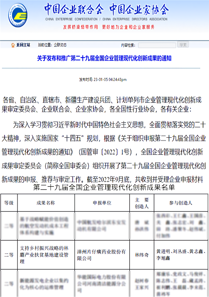 全国企业管理现代化创新成果审定委员会是1992年由原国务院经贸办批准设立的官方机构,负责主办全国企业管理现代化创新成果奖评选,该成果属国家级成果。据悉,本届审委会共受理全国664项创新成果申报材料,经过对申报材料进行初审、预审和答辩,共审定获奖成果219项,并由全国审委会组织终审公示。
