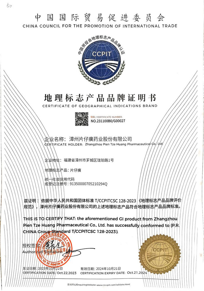 20231024日,以“地标赋能 贸通全球”为主题的“2023中国国际地理标志品牌合作大会”在河北省唐山市召开。大会期间,中国贸促会向片仔癀药业颁发首批《地理标志产品品牌证明书》。
