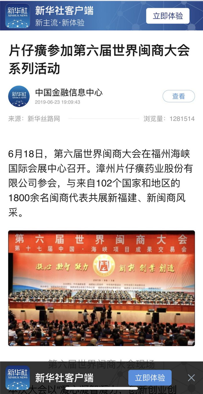 新华社报道片仔癀参加第六届世界闽商大会系列活动