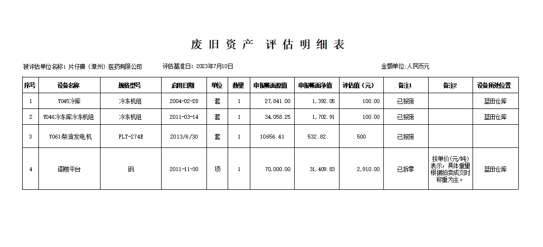 根据“福德信资评报字【2023】210号”评估报告书,本公司拟处理一批报废旧设备及钢平台,处理物品详见附件。