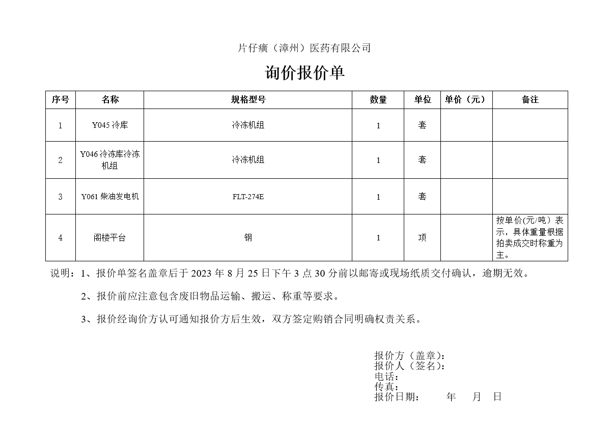 请以上企业将投标资料(营业执照、询价报价单等)加盖公章,于2023年8月25日下午3点30分前以邮寄封标或开标现场纸质交付确认,逾期无效,我司将组织人员现场进行公开拆标竞价。