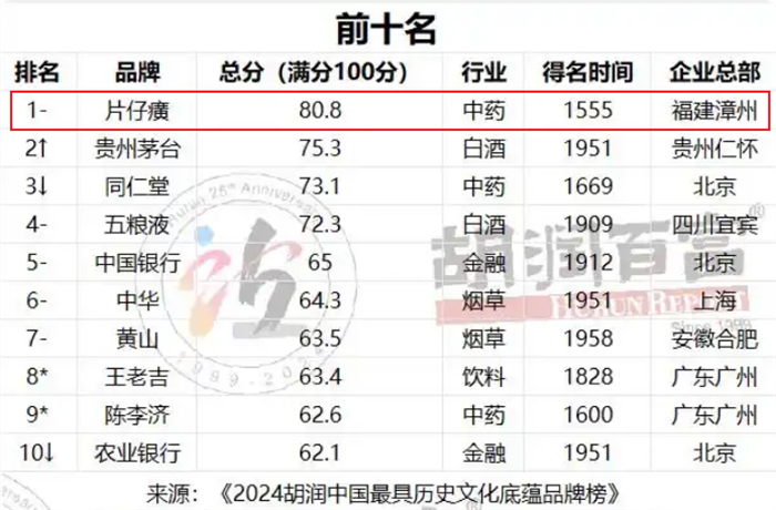 片仔癀荣登“2024胡润中国最具历史文化底蕴品牌榜”榜首