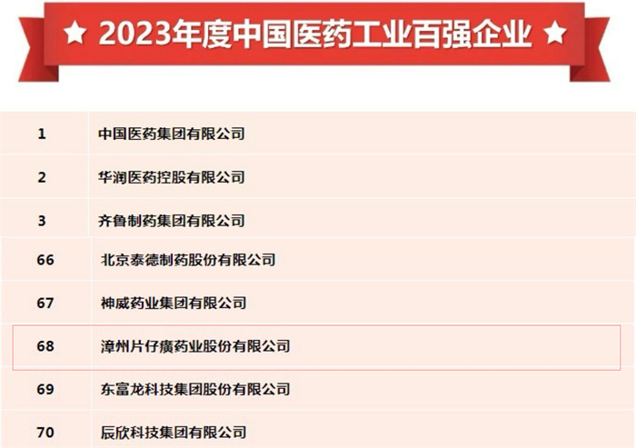 片仔癀药业入选“2023年度中国医药工业百强企业”第68位