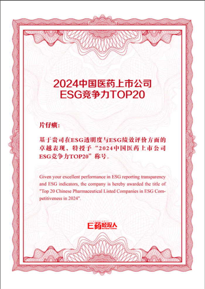 片仔癀公司被授予”2024中国医药上市公司ESG竞争力TOP20“称号