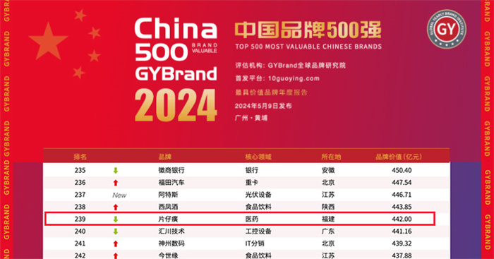 片仔癀品牌入选2024年GYBrand全球品牌“中国最具价值品牌500强”第239位