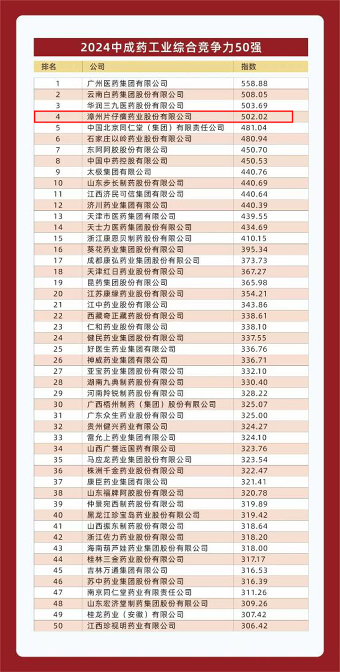 片仔癀药业荣获“2024中成药工业综合竞争力50强”第4名
