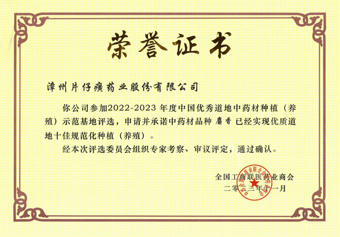 片仔癀药业麝香基地获评优质道地中药材十佳规范话种植(养殖)示范基地荣誉
