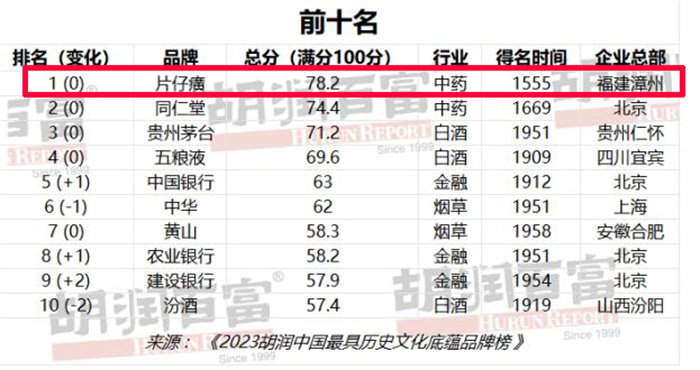 片仔癀荣登“2023胡润中国最具历史文化底蕴品牌榜”榜首