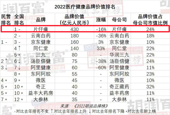 片仔癀以品牌价值430亿元荣登胡润“2022医疗健康品牌价值”榜首