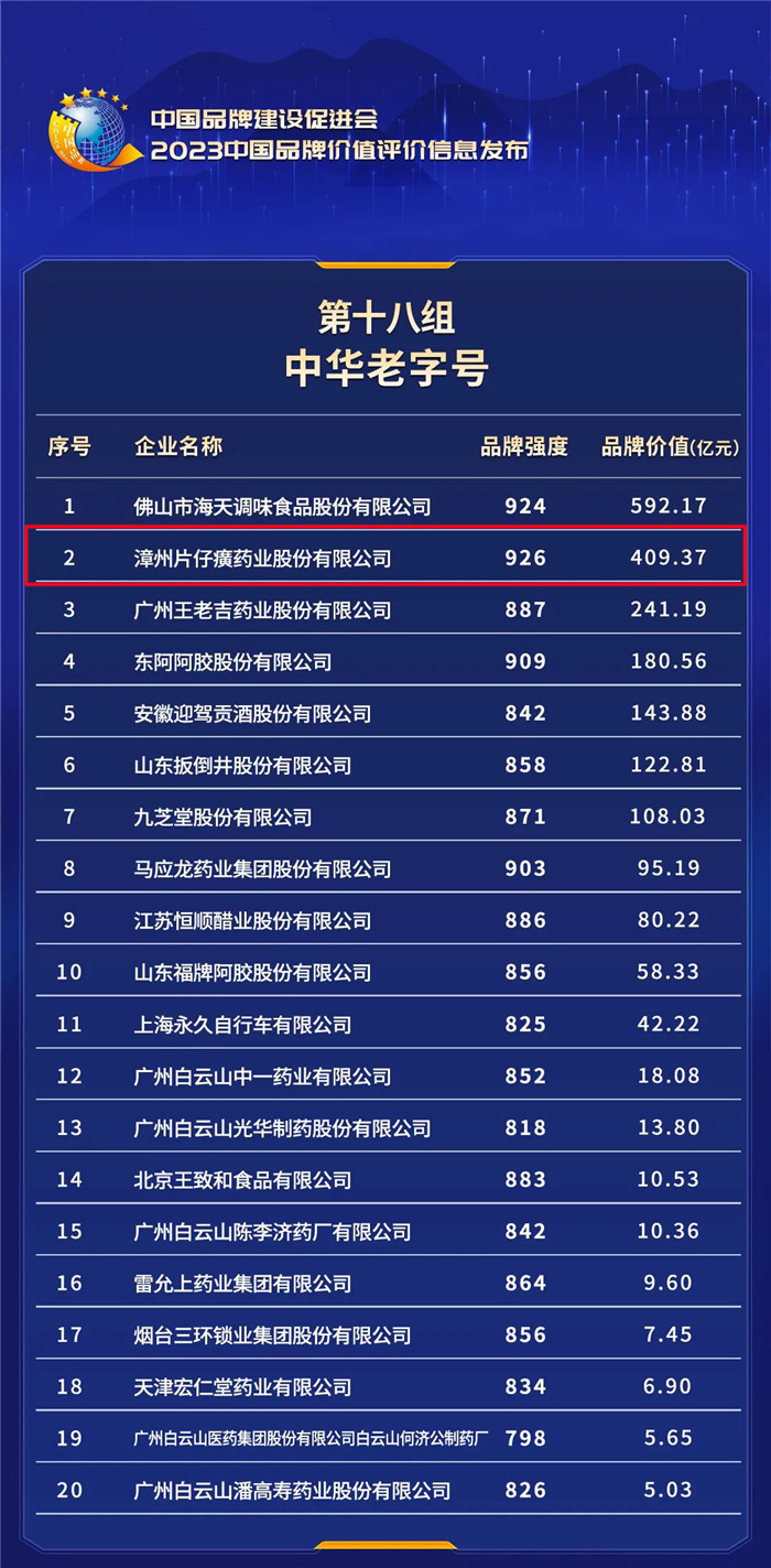 片仔癀以品牌价值409.37亿元,品牌强度926,位列“2023中华老字号品牌榜”第2位