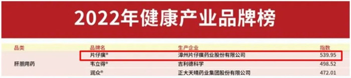 片仔癀品牌以指数539.95荣登“2022年健康产业品牌榜”肝胆用药类首位