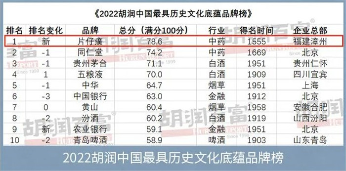 片仔癀荣登“2022胡润中国最具历史文化底蕴品牌榜”榜首