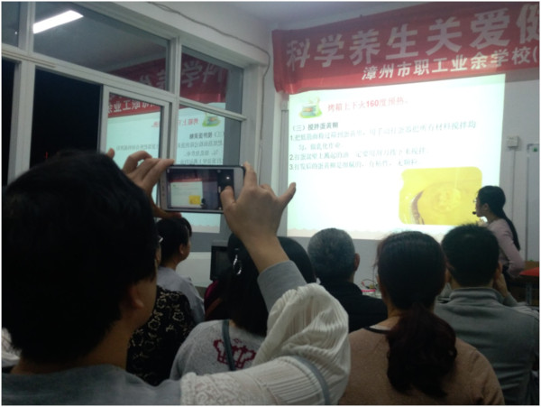 课程共分为西式面点和中式面点两个部分,分别由两名老师上课。授课过程中,两位老师首先讲解蛋挞、蛋糕、水饺、烧麦等各类中、西式面点的基础理论知识和制作要点。每个学员都非常认真听讲,用笔或用手机记下老师在讲台上写下的理论知识要点。