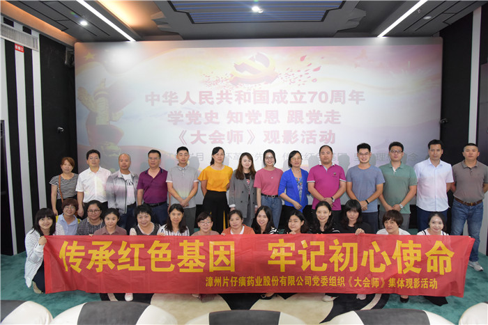 为迎接新中国成立七十周年,学习党的十九大精神,深入贯彻落实习近平同志关于“用党的历史教育党员、教育干部、教育群众尤其是教育青少年”的重要讲话要求,让广大党员干部群众通过观看影片,重温红色岁月、缅怀革命先烈,传承红色基因,坚定理念信念。522-23日晚,片仔癀药业公司党委组织“传承红色基因 牢记初心使命——集体观看电影《大会师》主题党日活动。”