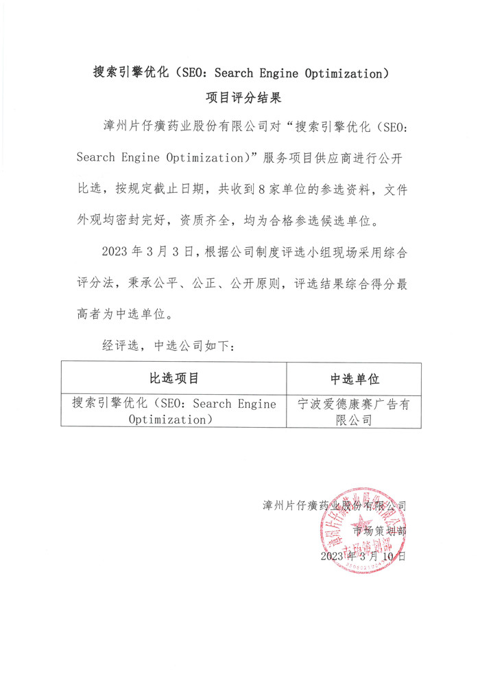漳州片仔癀药业股份有限公司搜索引擎优化(SEO:Search Engine Optimization)项目公开比选结果