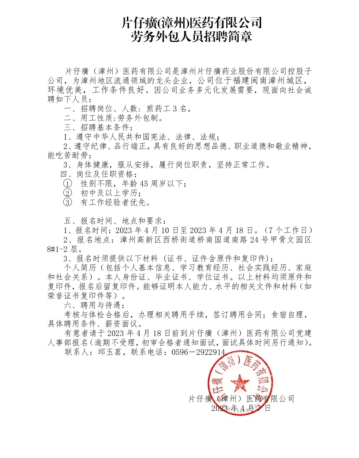 片仔癀(漳州)医药有限公司劳务外包人员招聘简章(煎药工)
