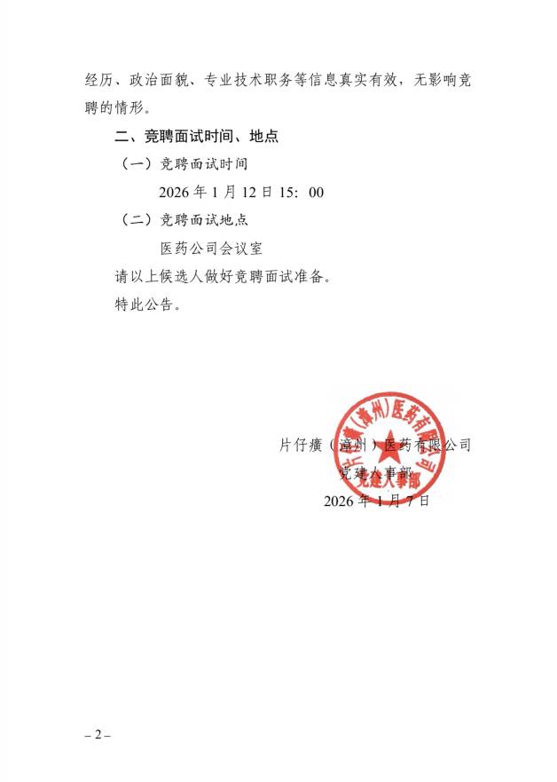 片仔癀(漳州)医药有限公司2025年度竞聘中层管理人员候选人名单及竞聘面试通知